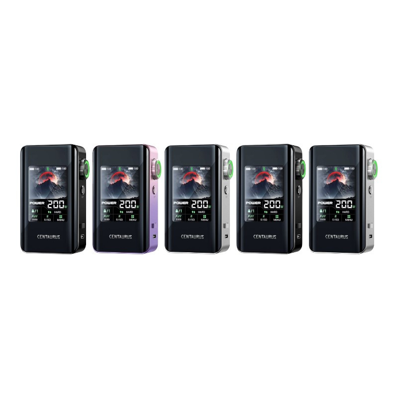 La Box Centaurus BT200 est un mod électronique à double accu 18650 (non fournis), développé par Lost Vape. Elle délivre une puissance maximale de 200 watts et dispose d'un grand écran couleur TFT de 2,4 pouces, personnalisable avec différents thèmes et fonds d'écran via une application smartphone connectée par Bluetooth 5.1. Cette application permet de régler finement les modes de vape (Power, Turbo, Voltage, VPC, contrôle de température pour Ti, Ni, SS316), de créer des profils personnalisés d'atomiseurs et de suivre la consommation en temps réel.